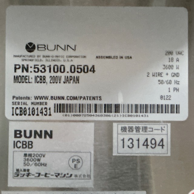 【中古】ラッキーコーヒーマシーン BUNN 業務用コーヒー抽出機 コーヒーブリュワー ポットブルーワー ICBB 水道直結式 2022年製