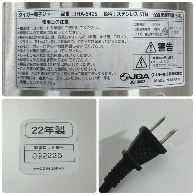 【中古】TIGER/タイガー 業務用 電子ジャー 保温ジャー JHA-540S ステンレス STN 容量5.4L 単相100V 2022年製