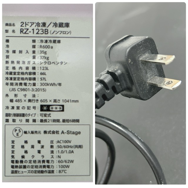 【中古】A-Stage/エーステージ 2ドア冷凍冷蔵庫 家庭用冷蔵庫 ノンフロン冷蔵庫 ボトムフリーザー RZ-123 B ブラック 123L 2019年製