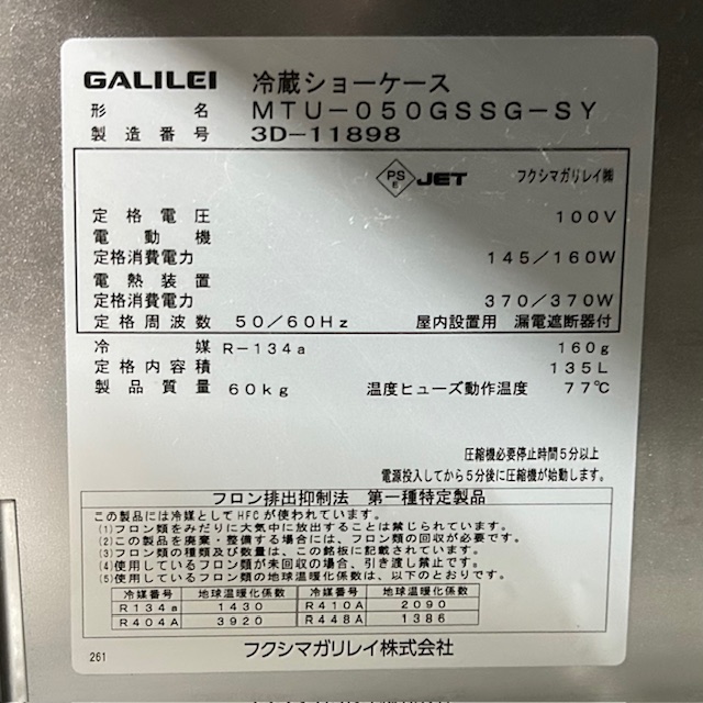 【中古】GALILEI/フクシマガリレイ ガリレイ 業務用冷蔵ショーケース MTU-050GSSG-SY W470×D510×H1,410(mm) 2023年製
