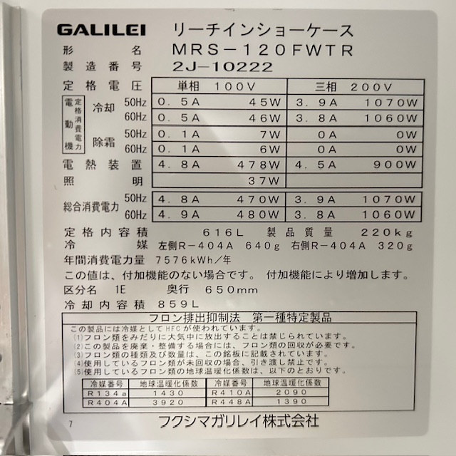 【中古】GALILEI/フクシマガリレイ 業務用 リーチインショーケース 冷蔵ショーケース 冷凍機内蔵型 MRS-120FWTR 2022年製