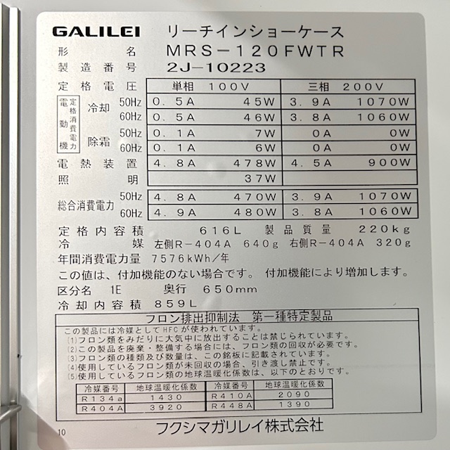 【中古】GALILEI/フクシマガリレイ 業務用 リーチインショーケース 冷蔵ショーケース 冷凍機内蔵型 MRS-120FWTR 2022年製 ※モーター音大