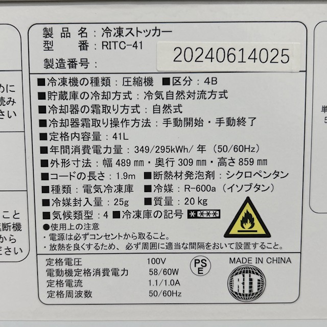 【中古】JCM/ジェーシーエム 業務用 RIT冷凍ストッカー 業務用冷凍庫 ストッカー RITC-41 41L W489×D309xH859(mm) 2024年製 | 集まる!厨房の森