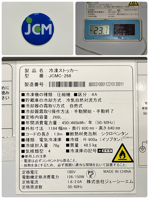 【中古】JCM/ジェーシーエム 業務用 冷凍ストッカー 業務用冷凍庫 ストッカー 226L JCMC-266 W1,184×D600xH840(mm) 2023年製