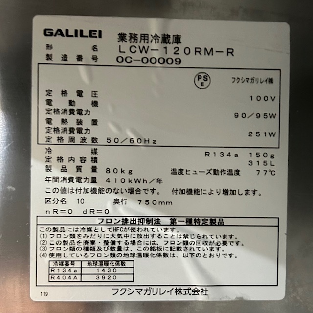 【中古】GALILEI/フクシマガリレイ 業務用 コールドテーブル冷蔵庫 ヨコ型業務用冷蔵庫 LCW-120RM-R 2020年製 ※特注天板